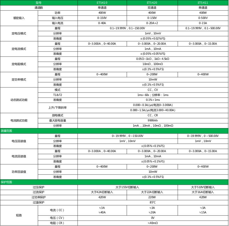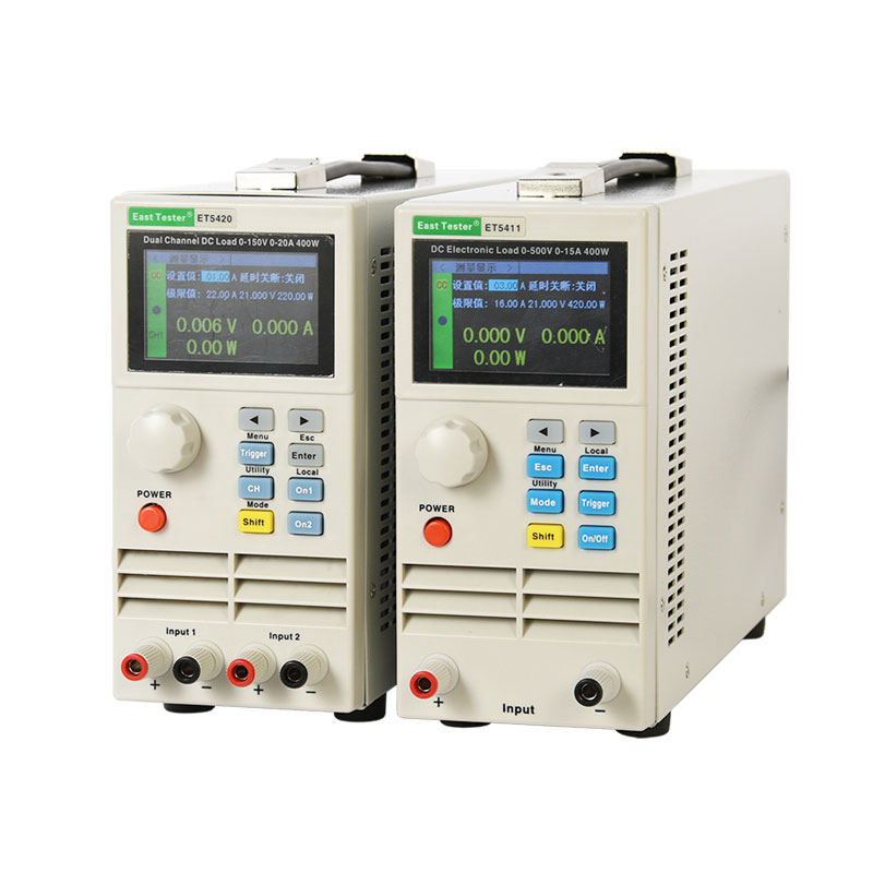 ET54系列单/双通道可编程直流电子负载,采用高性能芯片,高速,高精度设计,提供1mV、1mA的解析度,性能优越,可广泛运用于充电器,开关电源,线性电源,各类电池等行业的生产线测试,科研机构等试验研发领域。